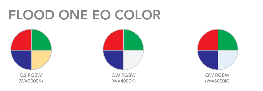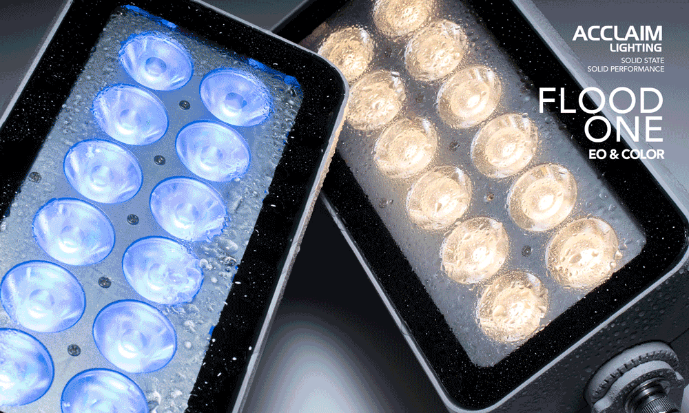 Flood One EO is a high output, outdoor rated, color-changing or white LED model floodlight built on the Acclaim Modular System platform. It features an internal 100-277VAC power supply, 0-100% DMX/RDM dimming, and a very low profile design to fit into small spaces.
