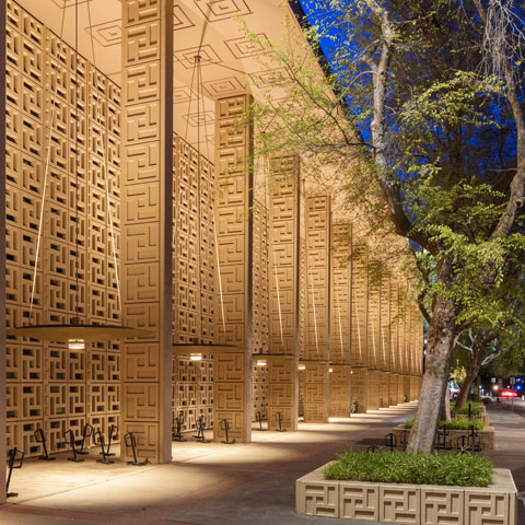 The large pendants, hanging approximately 27’ below the roof overhang and 9’-6” above the ground are quite spectacular. Ever since I first saw these pendants, I felt that uplighting to feature the intricate facade and roof overhang as well as downlighting to improve the illuminance on the walkway would look wonderful. I had no idea that this was the original intent of the architect until we began to work on this project.