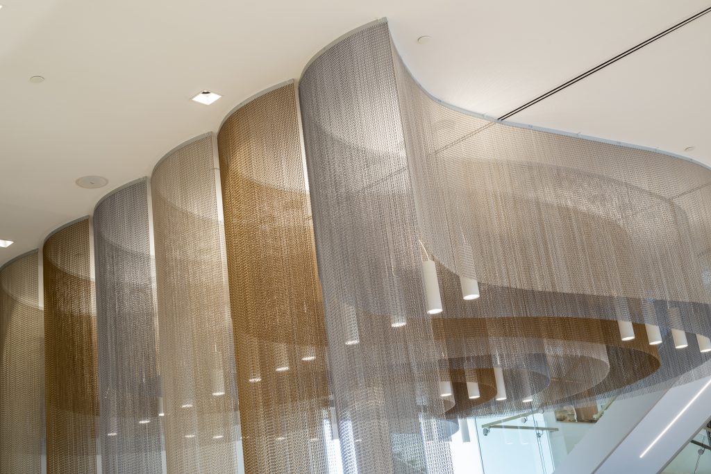 An ornate display of draping wire meshes can be seen on the left side of the space. What was the design inspiration behind this wave-like pattern?